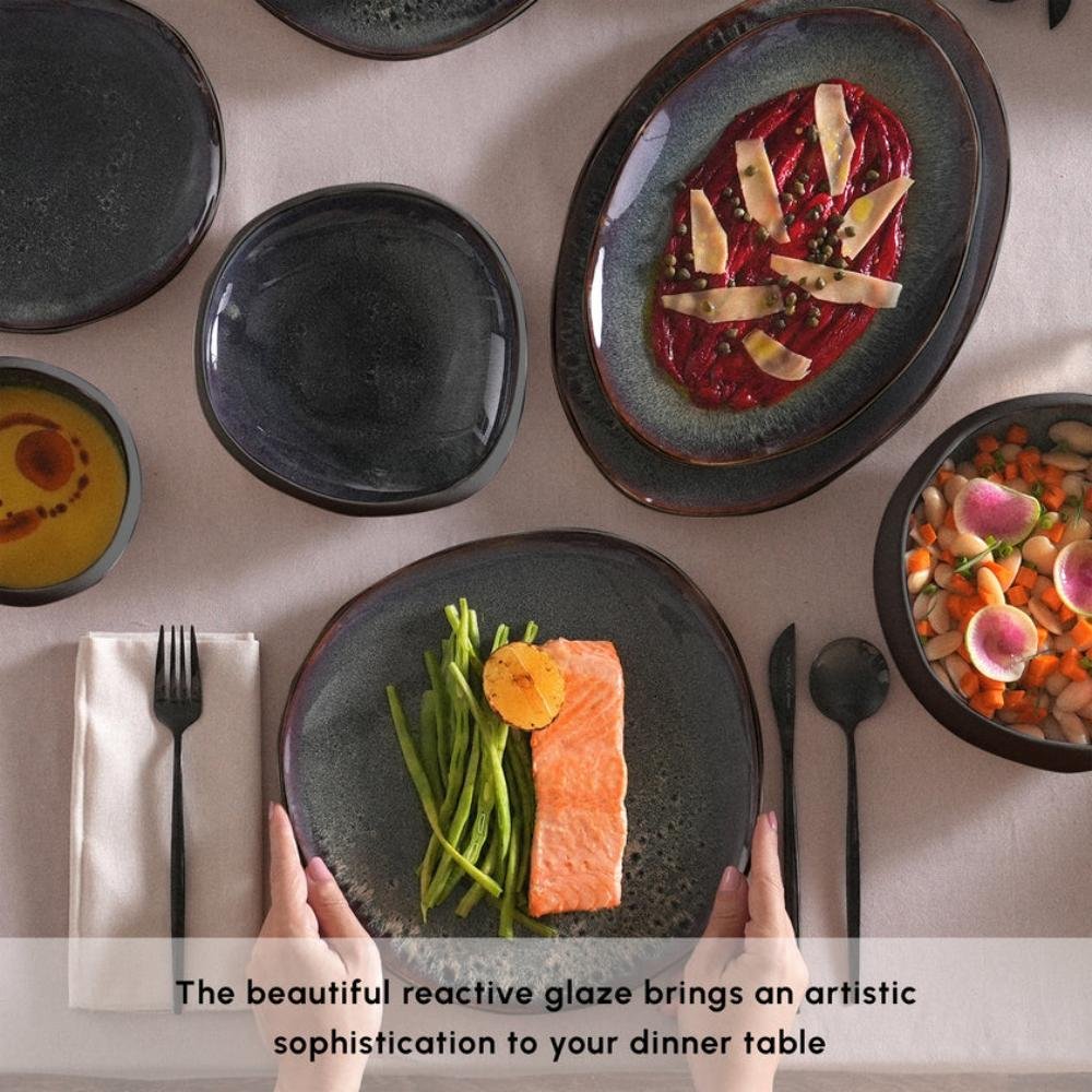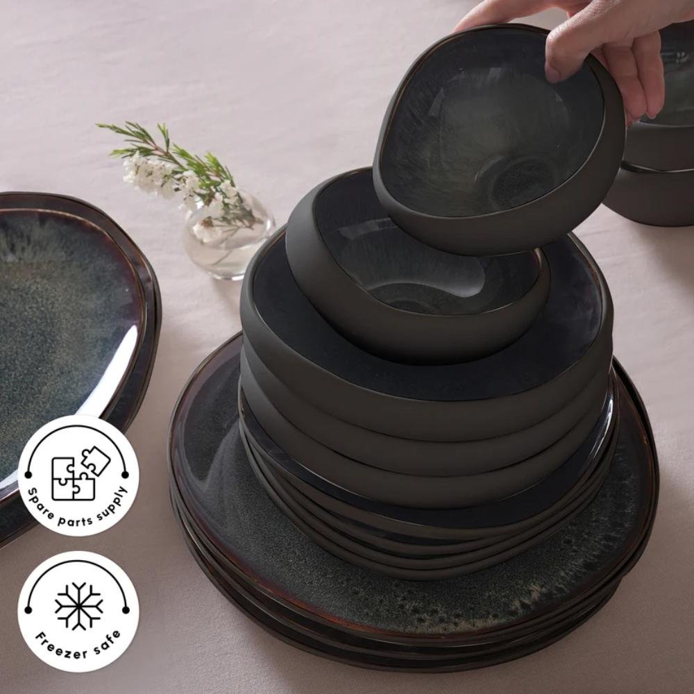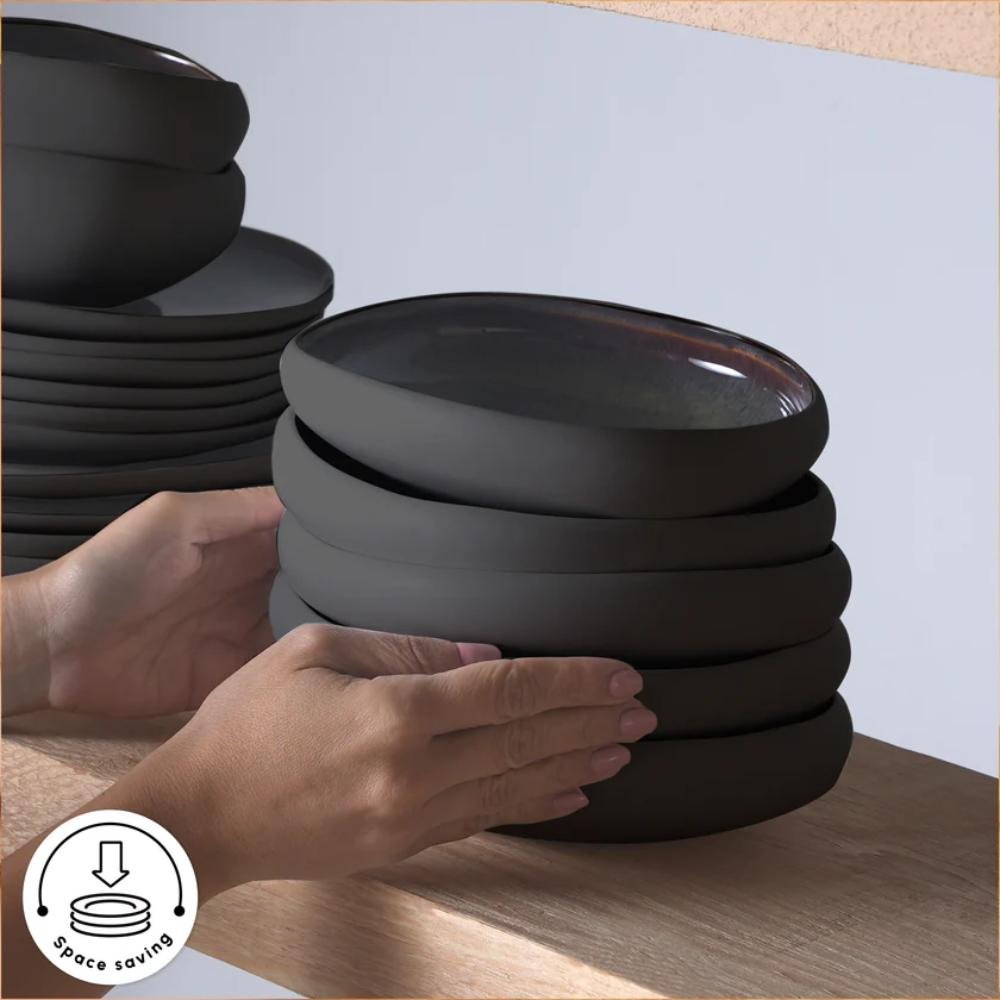 A modern and artistic dinner set inspired by natural organic forms and flowing lines. Finished in a sleek black reactive glaze, each piece features subtle variations that create a unique handcrafted aesthetic for a refined table presentation.