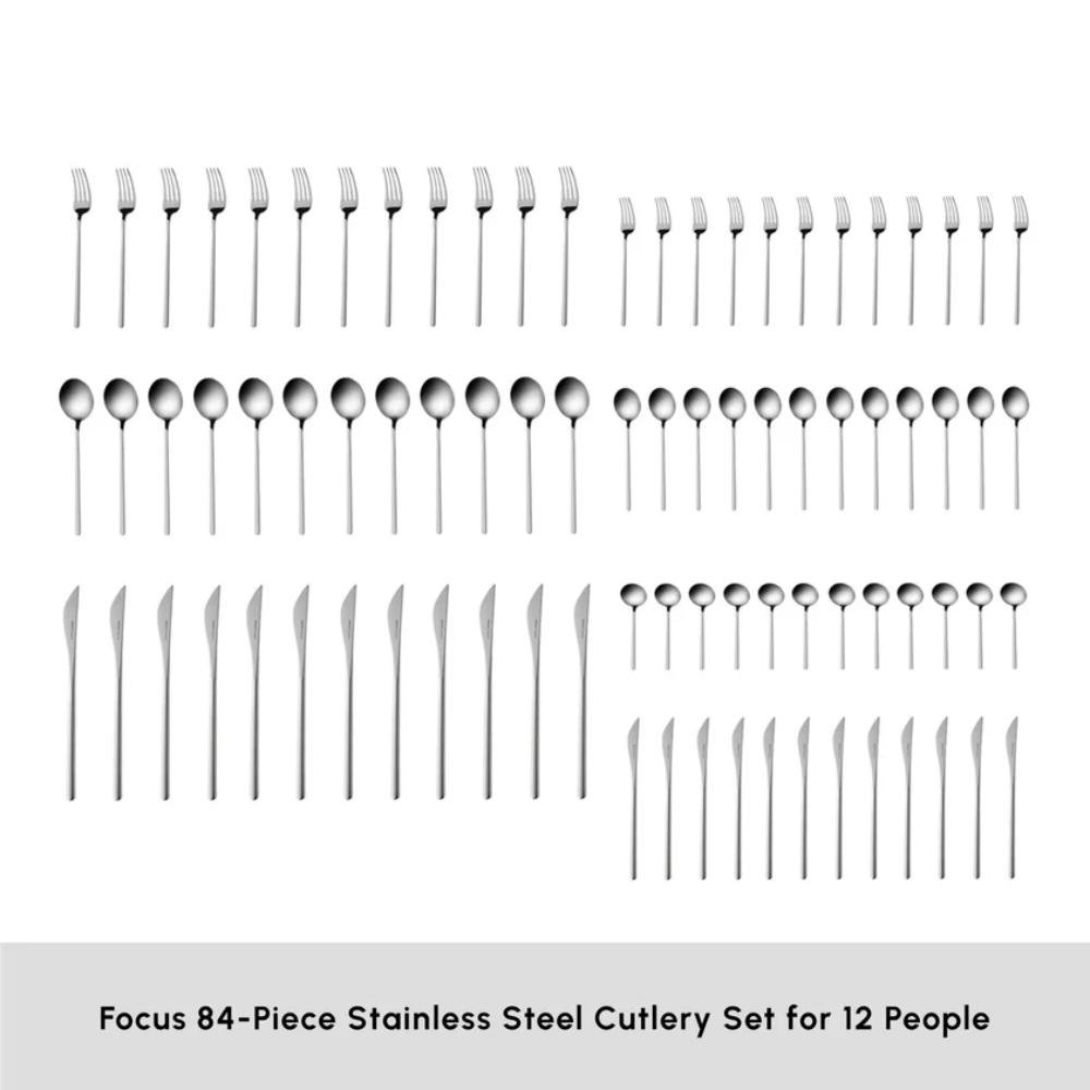 Karaca Focus 84-Piece Stainless Steel Cutlery Set for 12 People | Platinum Finish