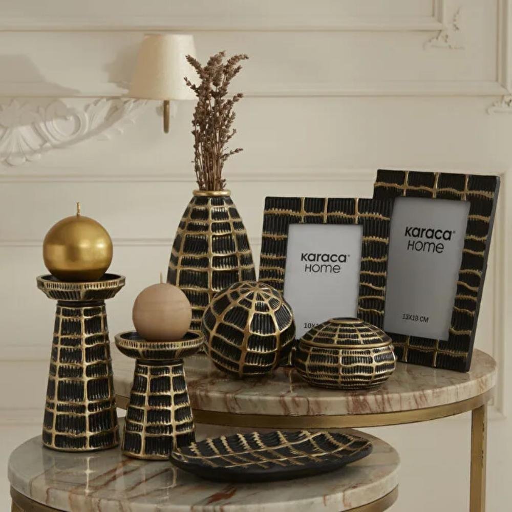 A timeless and elegant photo frame designed to beautifully display your cherished memories. Its refined black and gold finish adds a sophisticated decorative touch to any interior space.