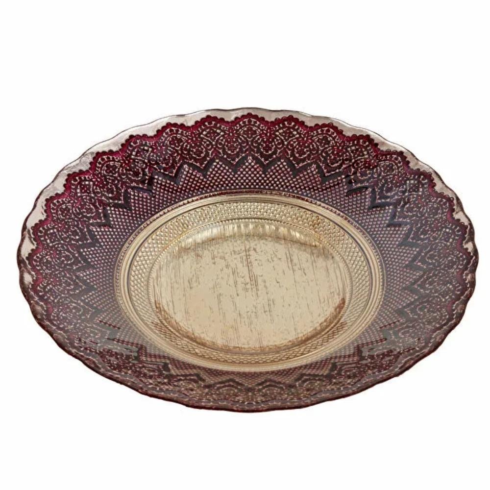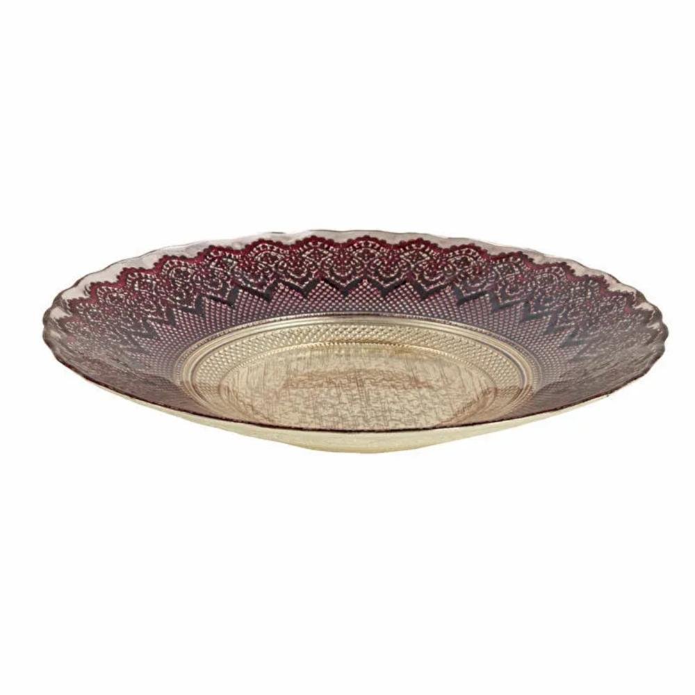 Enhance your interior Decor with the Karaca Home Palmyra Decorative Plate. Crafted from elegant glass, this statement piece features a rich bordeaux pattern framed with refined detailing and a luxurious gold-finish base, creating a sophisticated and timeless decorative accent.