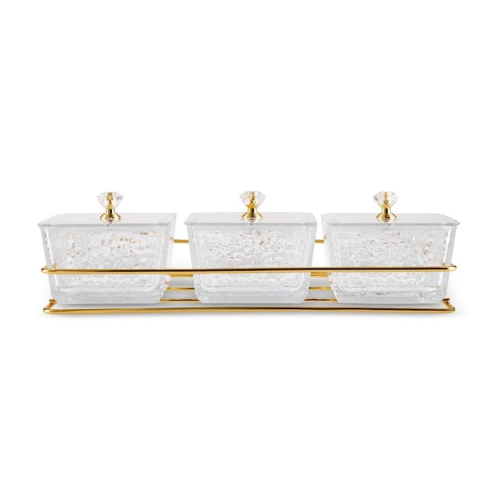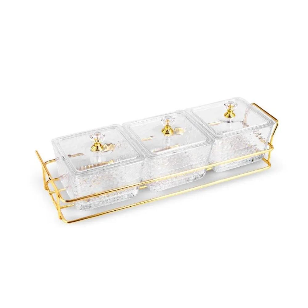 Featuring transparent glass bowls with matching lids, it combines functionality with a luxurious decorative touch.