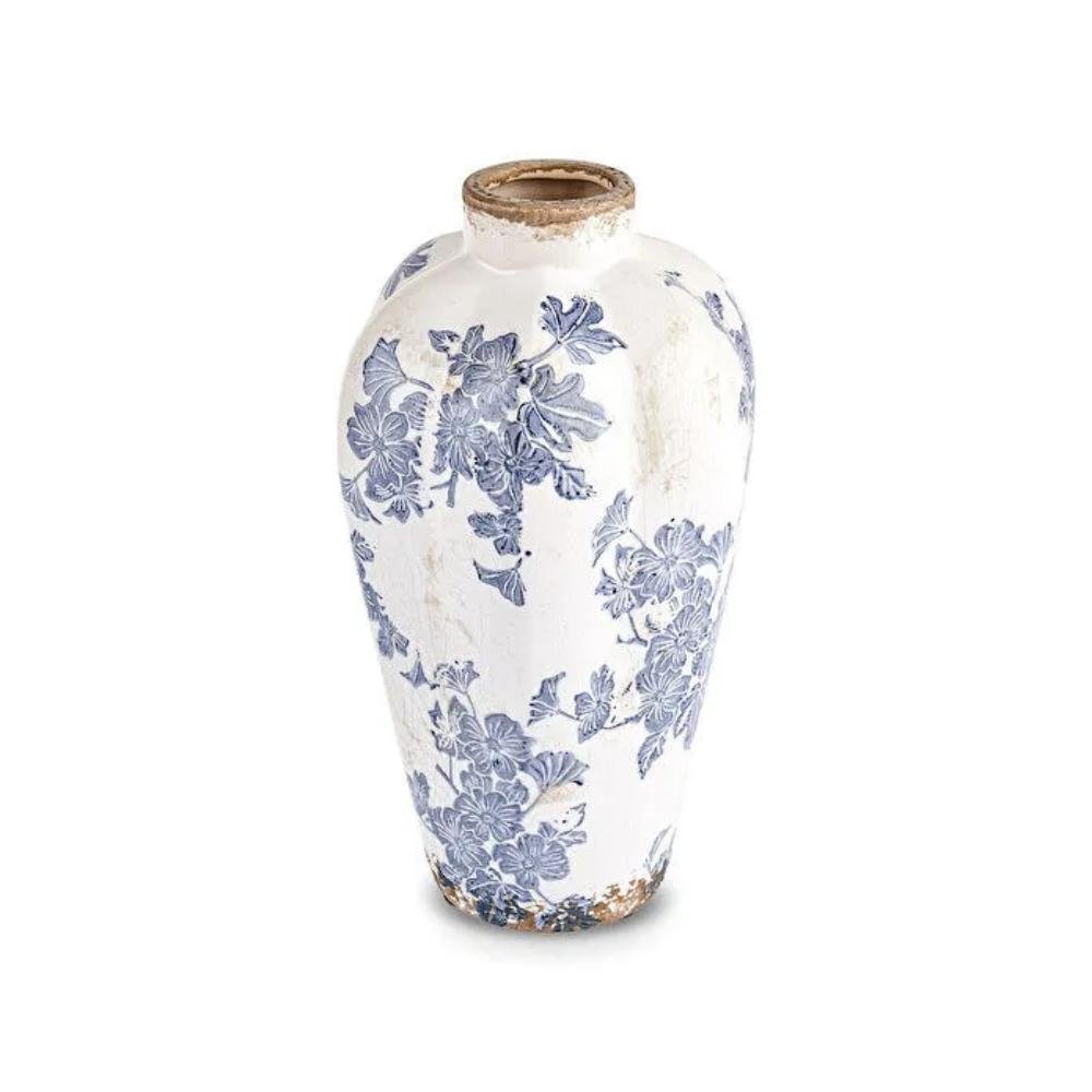 Add a fresh decorative touch to your space with this elegant vase featuring a white base adorned with delicate blue floral shapes.