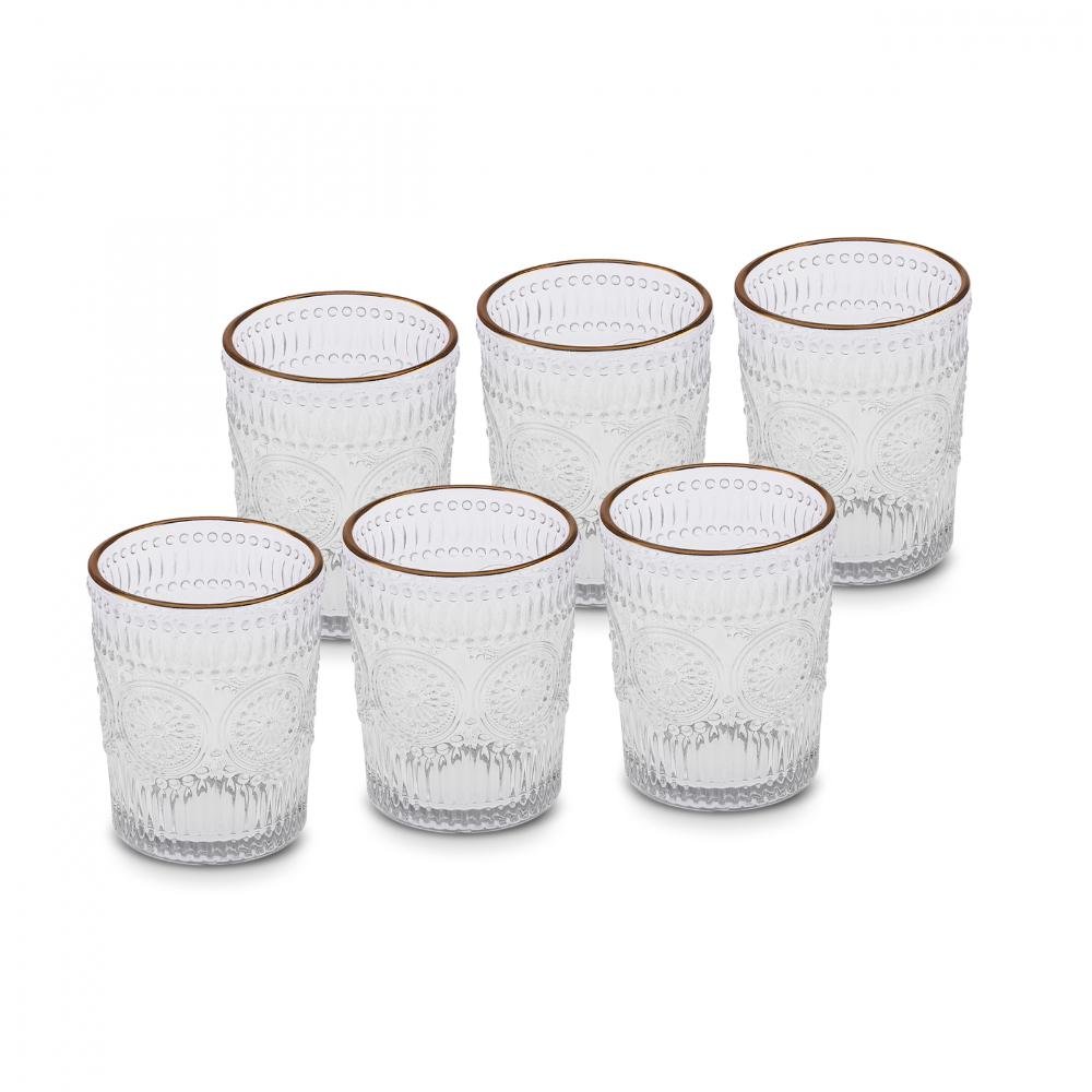 Serve your drinks in style with the Karaca Sunflower Set of 6 Beverage Glasses, featuring elegant gold-rim detailing.